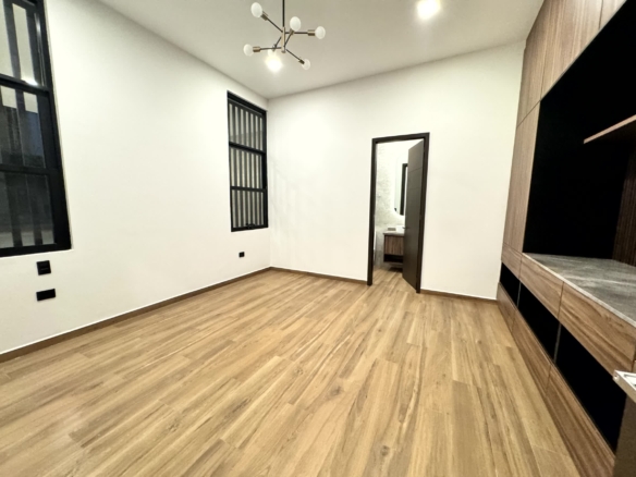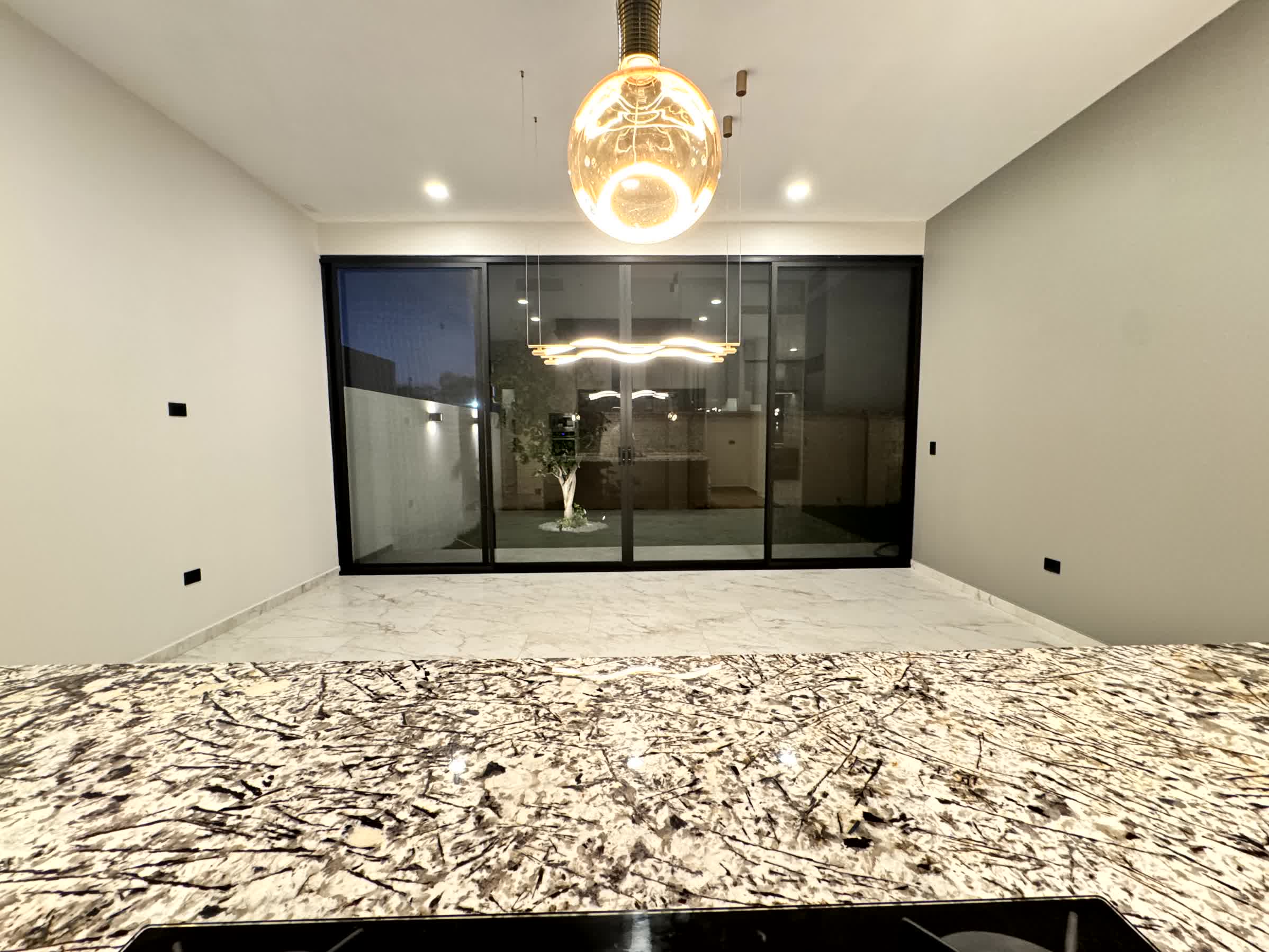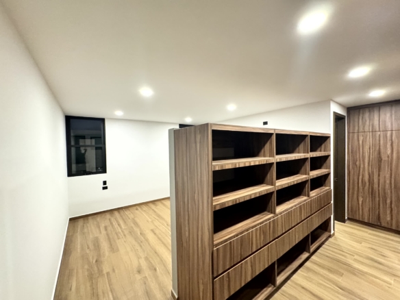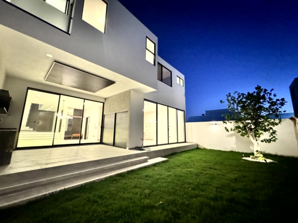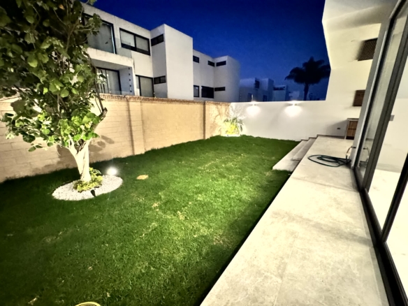 Cochera 3 autos. Jardín posterior de 60 m2. Sala con closet de usos múl ples. Área de escalera con muros chapa de encino y domo de cristal. Recámara con baño completo y closet amplio que puede servir de estudio, gym o sala de cine. Medio baño de visitas. Cocina con isla y cuarto amplio de alacena con estanterías que se entrega con ex tintor para cocina tipo K. 60 m2 de jardín trasero (9×5.07). Terraza con barra de bar. Bodega para herramientas de jardinería y suavizador.