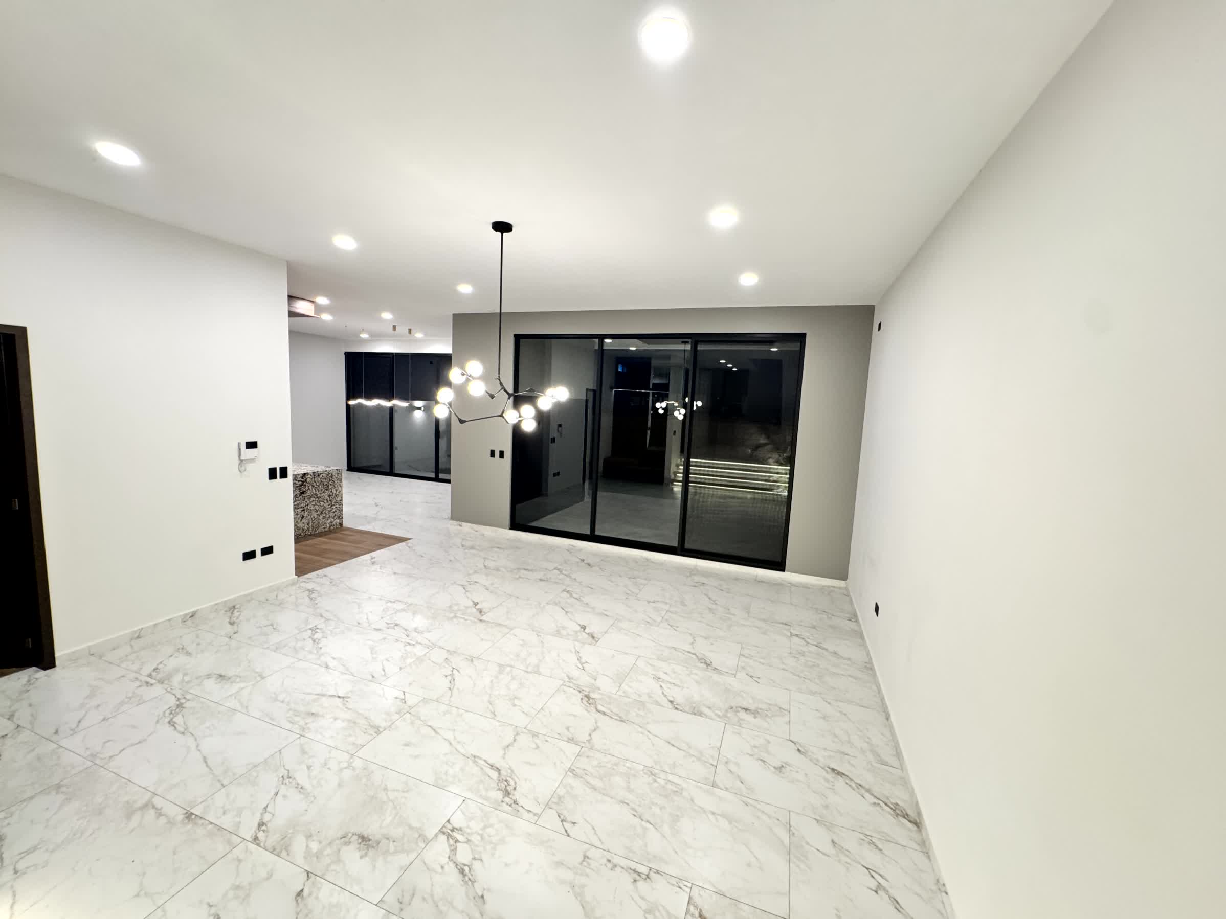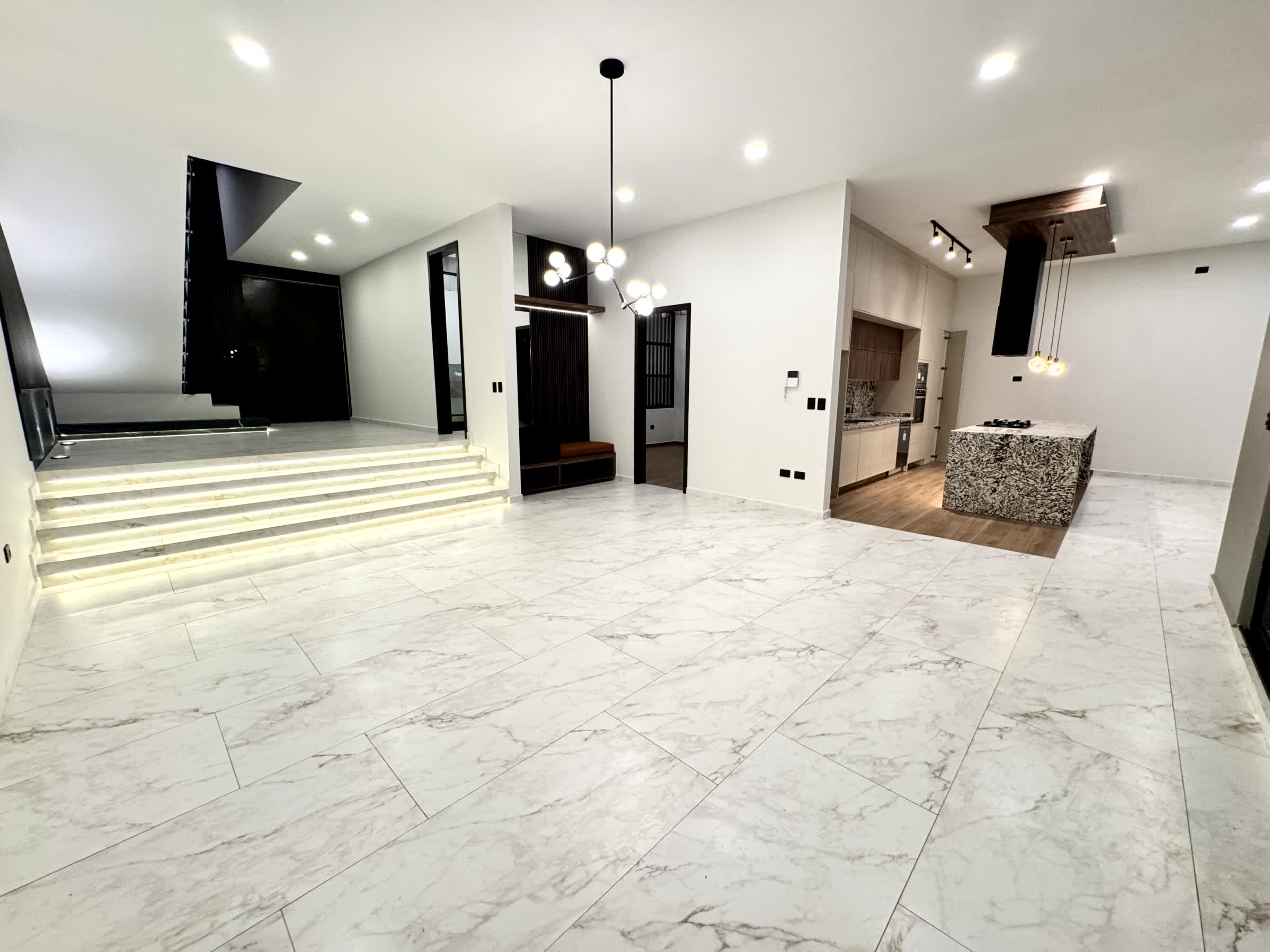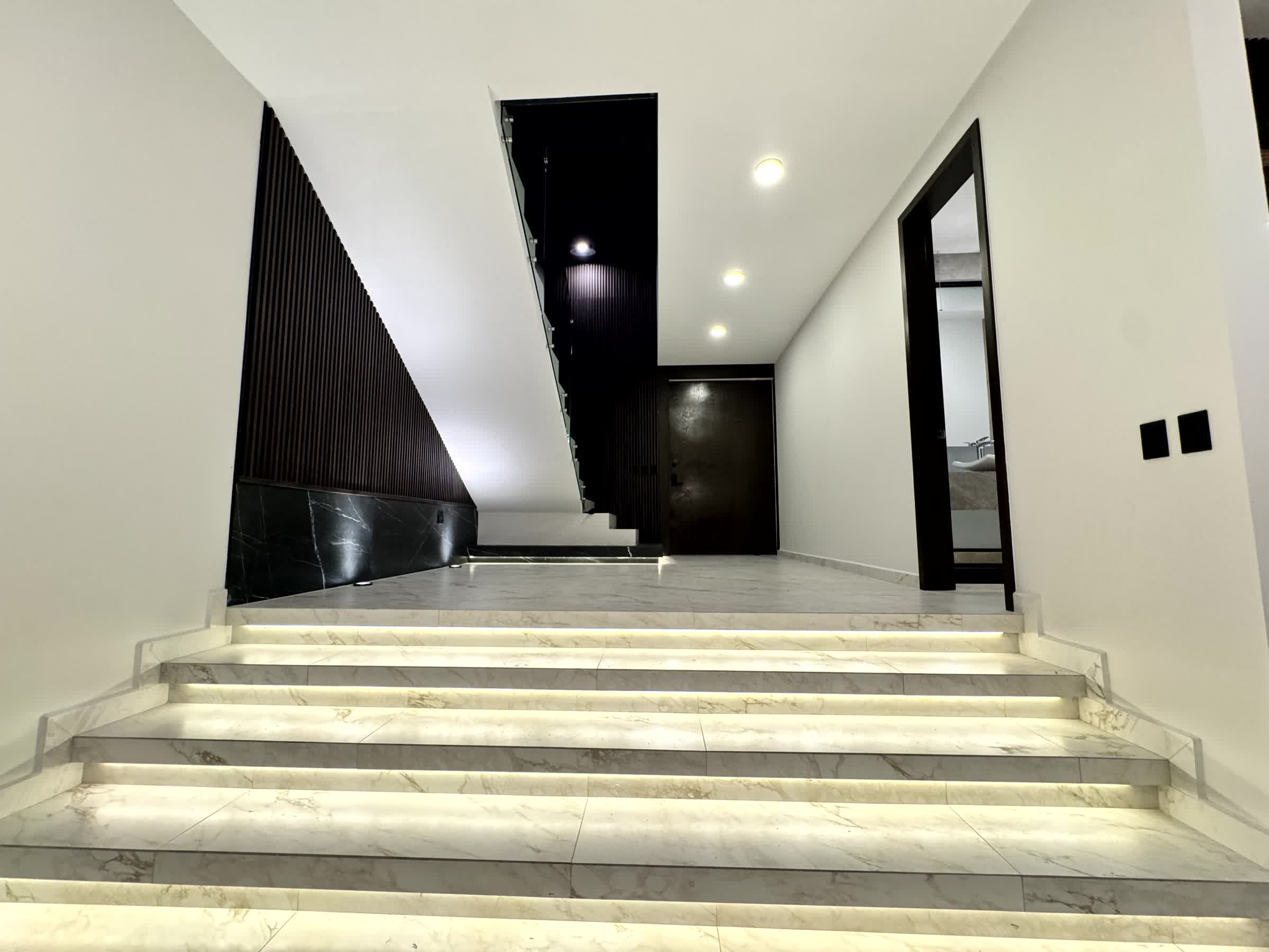 Planta Baja con altura de 3.30 mts. Cocina al alto brillo equipada con torre de hornos io Mabe, lavavajillas 12 servicios io Mabe. Encimeras de cuarzo delicatus. Acceso principal con chapa inteligente; video portero inteligente apagadores inteligentes para luces de exterior control WiFi-Alexa. Preparación para: Circuito cerrado, calentador solar, suavizador, celdas fotovoltaicas, 5 mini splits. Servicio de gas natural. Cisterna 10,000 lt. Espejo de agua exterior de 8 m2 con fuente de gran esfera de mármol de 1 ton.