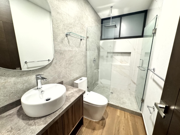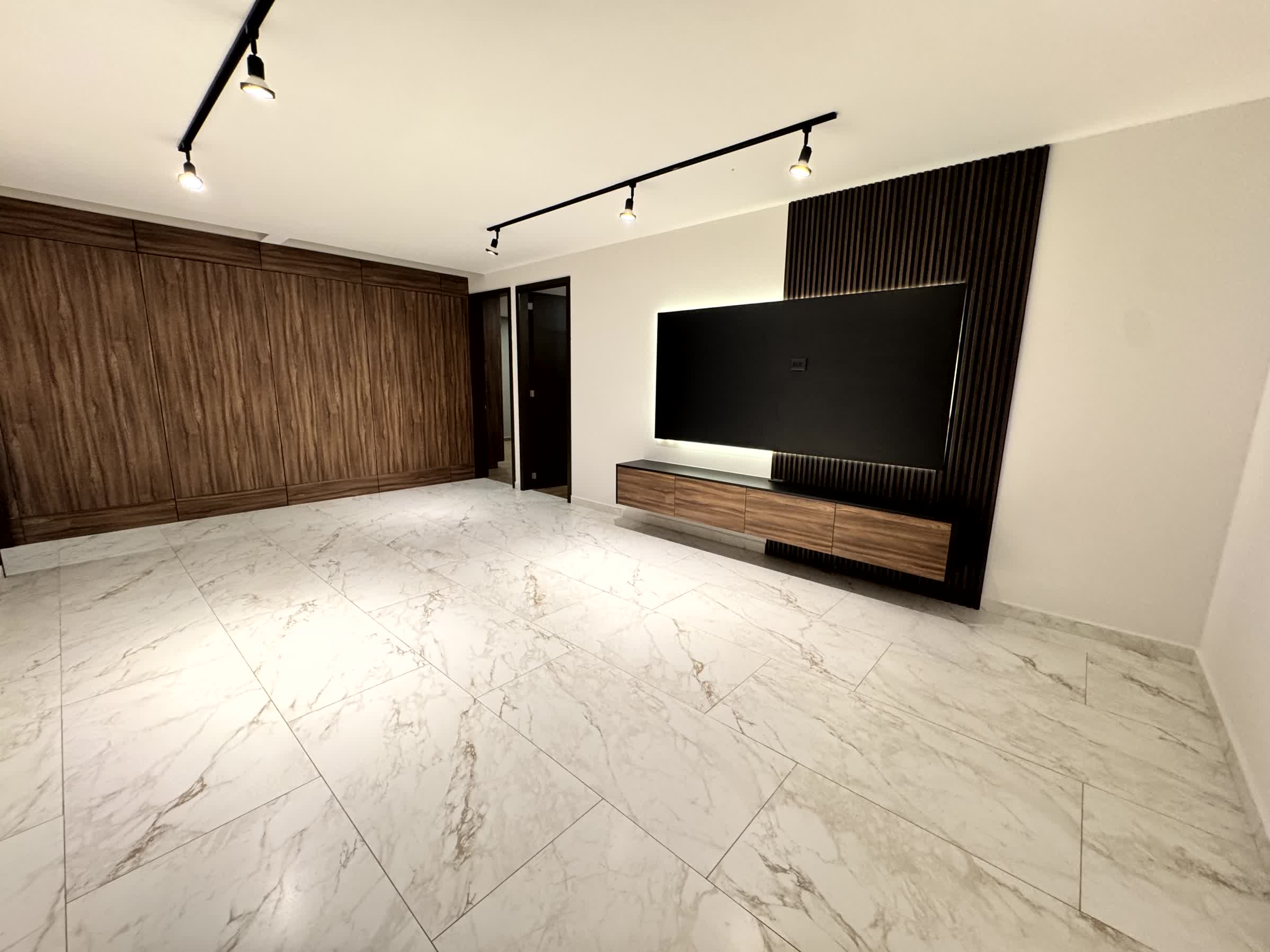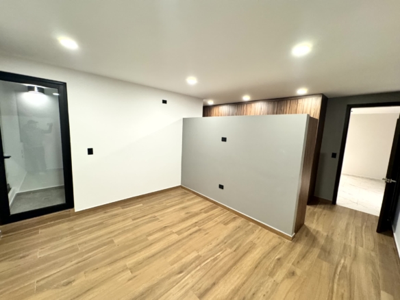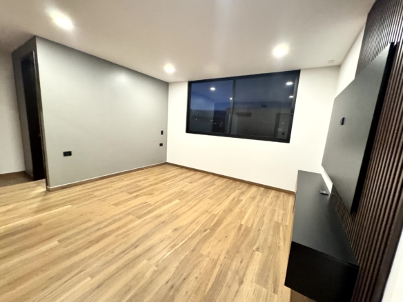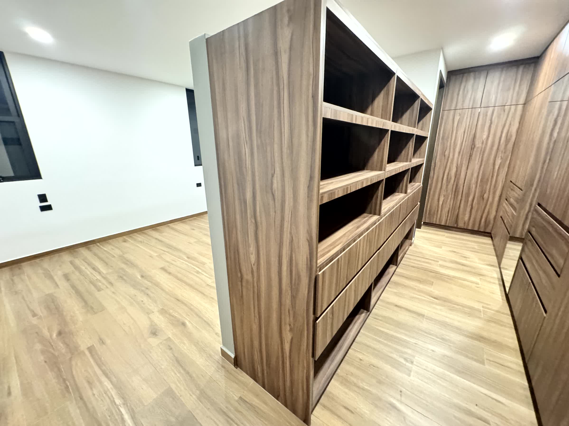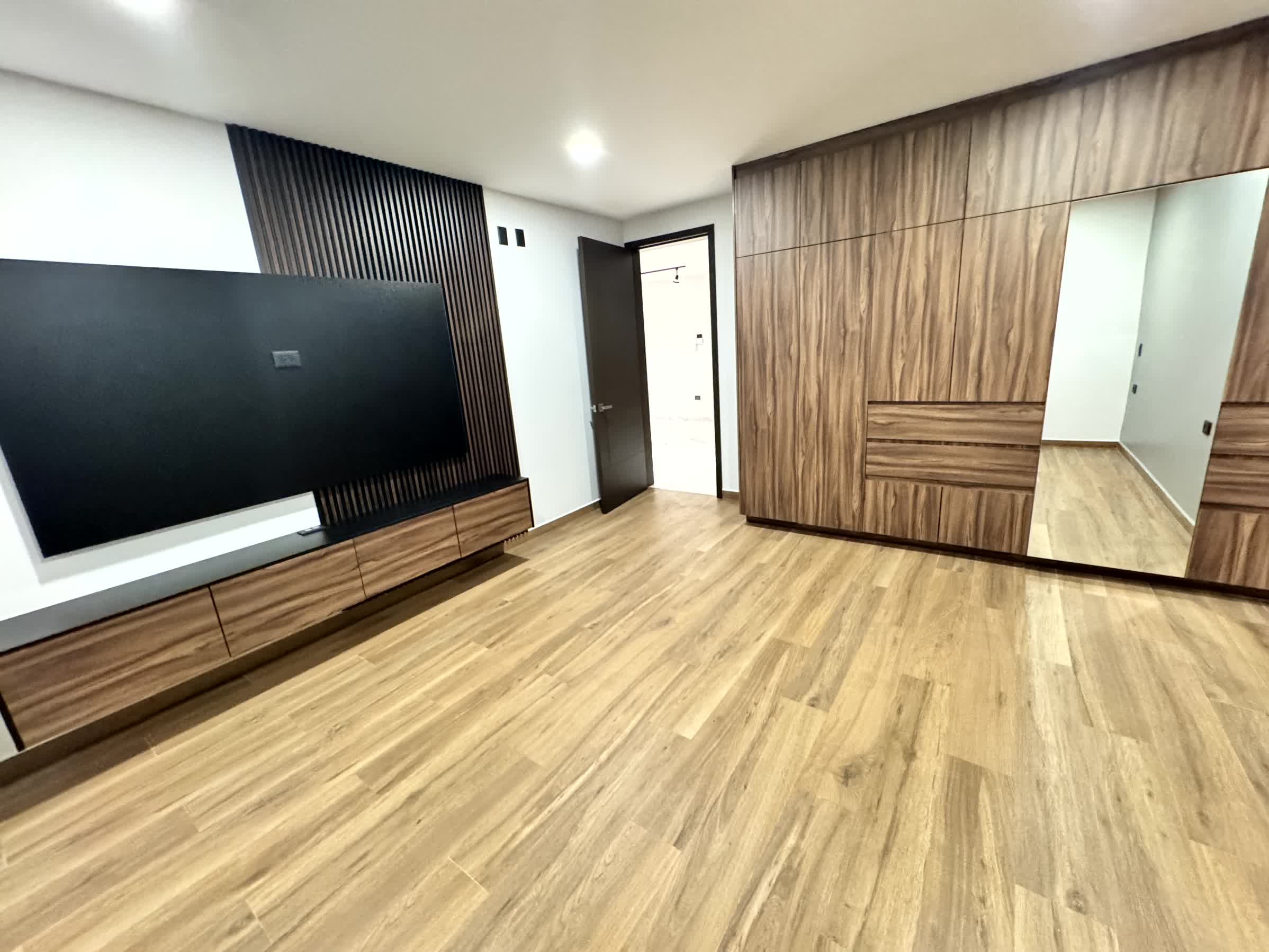 Sala de TV con mueble de TV Wall Recámara secundaria 1 con baño completo; Gran walking closet,, balcón techado con un domo de cristal y con barandal de cristal templado, instalaciones para mini split. Recámara secundaria 2 muy amplia con baño completo; más de 4.0 m de closet, escritorio, mueble de TV wall, instalaciones para mini split. Recámara principal con ves dor de 20 m2 con isla, banca y tocador. Iluminación led en vestidor y colgante led grande. Dos lavabos con cubierta de mármol. Cuarto de WC; área de regaderas con banca, tiene regadera de plafón y regadera con ajuste de altura cada una con instalación hidráulica independiente (pueden funcionar las dos al mismo tiempo). La recámara ene salida por cancel hacia un muy amplio balcón.