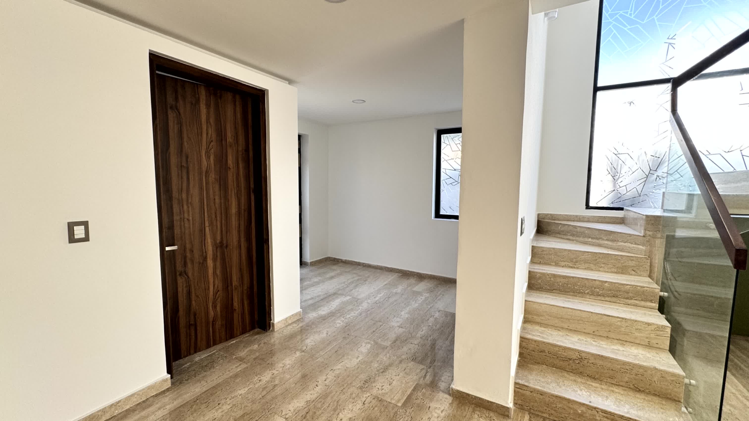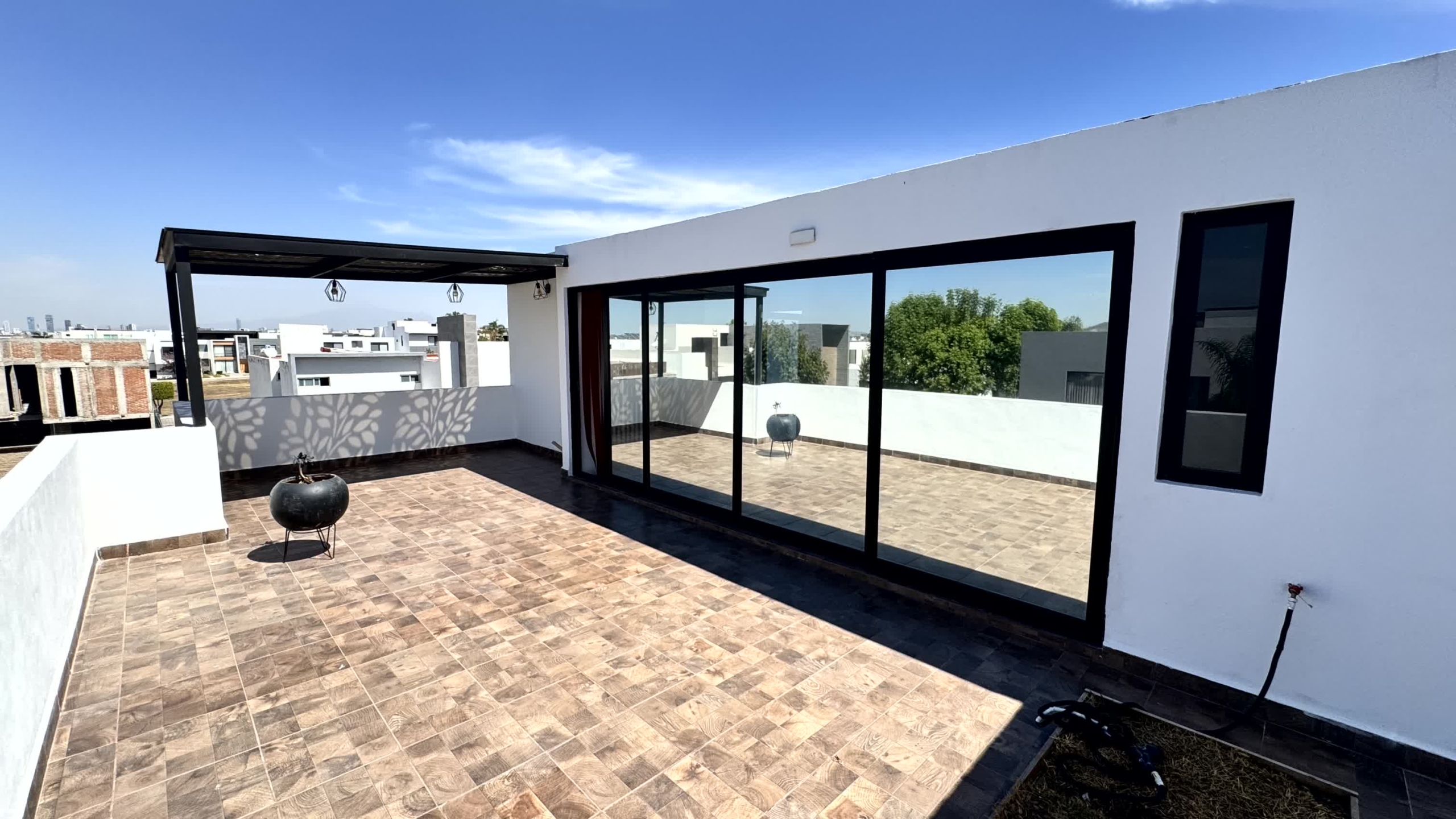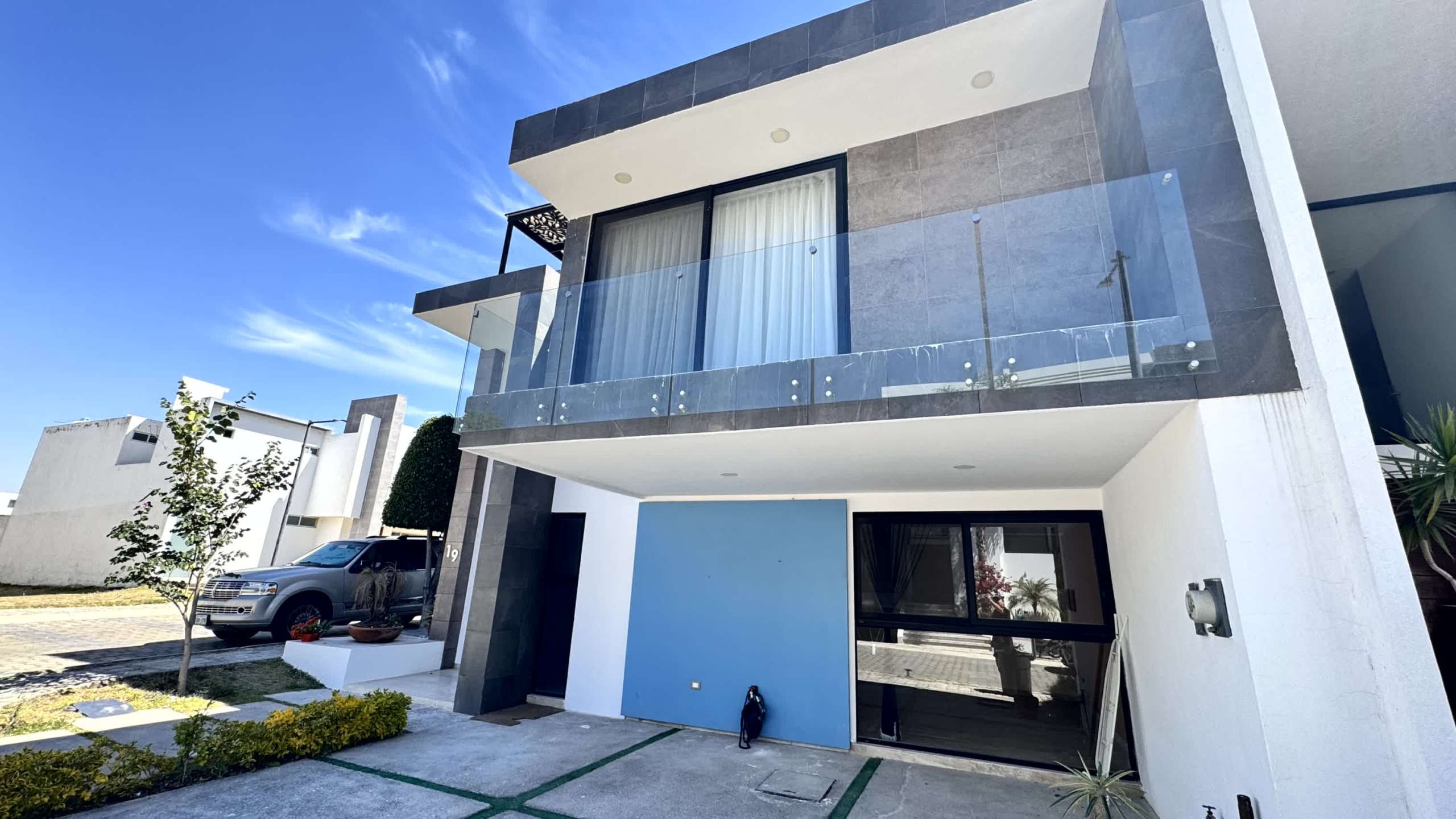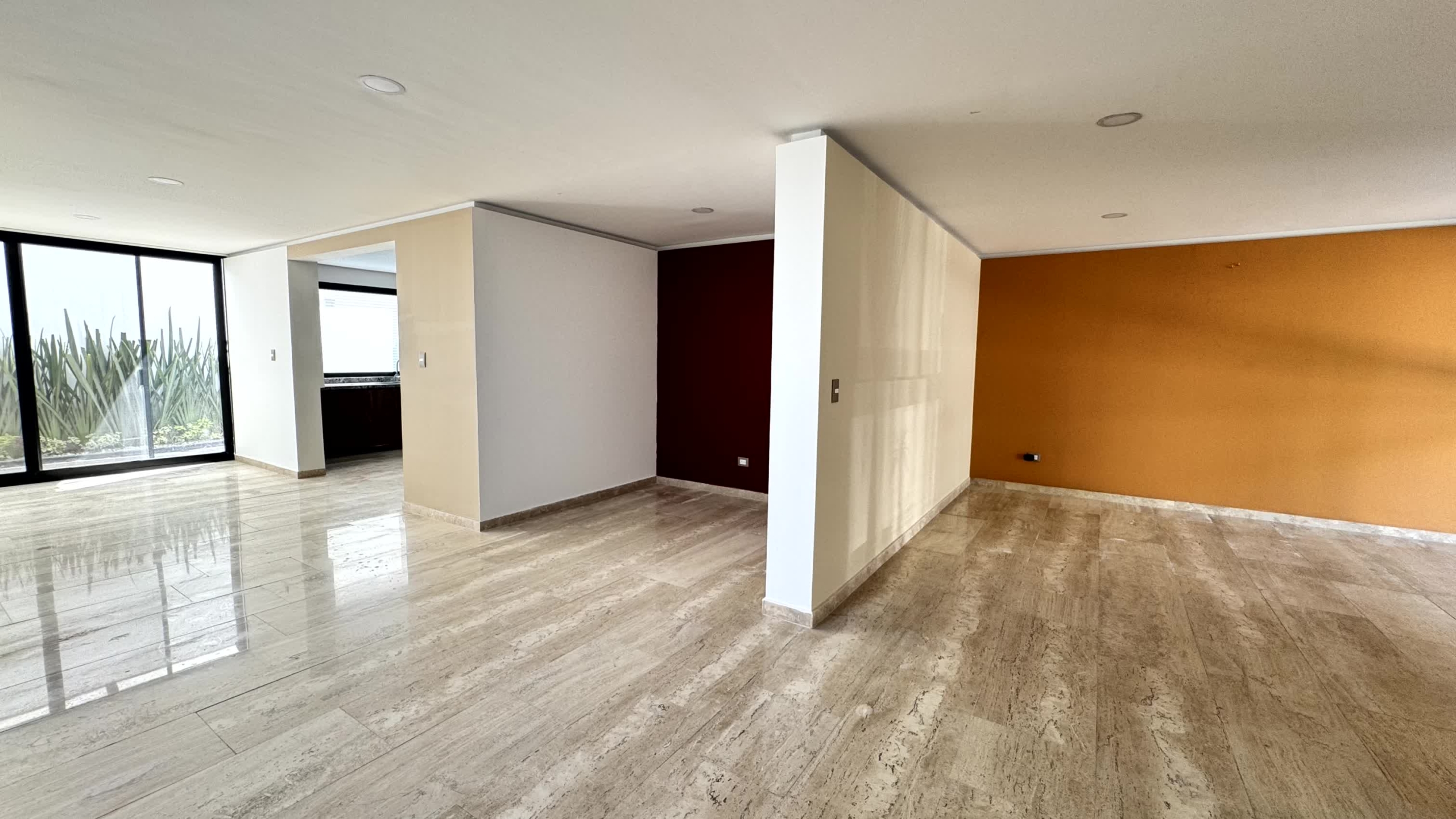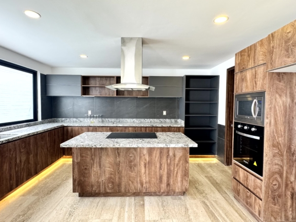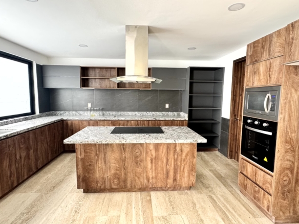 Cochera para 2 autos, recibidor, medio baño de visitas, sala, comedor, estudio, cocina, alacena, jardín, sala de tv, 3 recamaras cada una con baño, la recámara principal con vestidor, Family room y roof garden, área de servicio con baño.