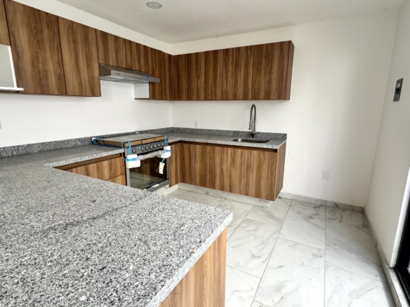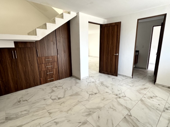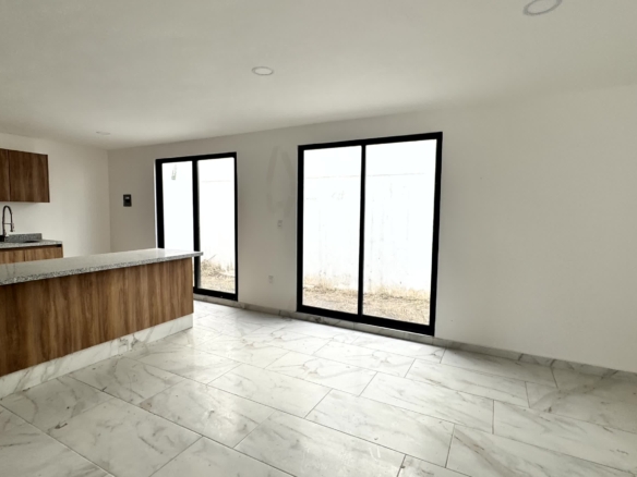 PB: cochera para 2 autos, recámara con baño completo, sala, comedor, cocina con barra desayunadora, jardín.